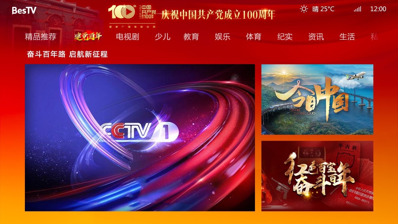 百视通IPTV资讯板块全新建党百年主题专区于6月28日升级上线,并在首页首屏做重点推荐,专区内除了滚动更新最新的建党百年活动相关报道外,还会重点推荐多部优秀纪录片和专题片。唱响共产党好、社会主义好、改革开放好、伟大祖国好、各族人民好的高昂旋律。