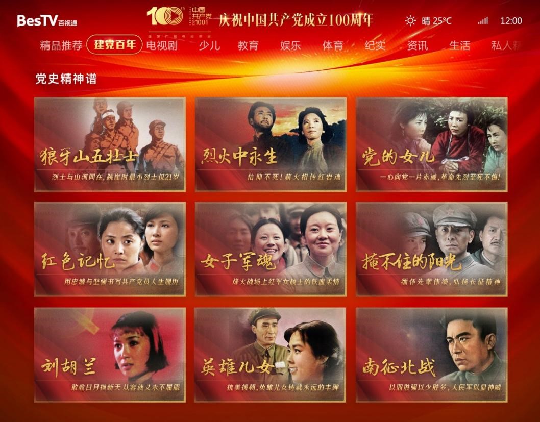 百视通IPTV还推出“百年寻梦 知史而奋进”影视主题专区,展映《党的女儿》、《闪闪的红星》、《铁道游击队》、《英雄儿女》、《横空出世》、《铁人》、《我和我的祖国》等影视剧,百视通OTT将于7月推出电影专题“党史精神谱”,在红色光影中回顾中国共产党的峥嵘岁月。