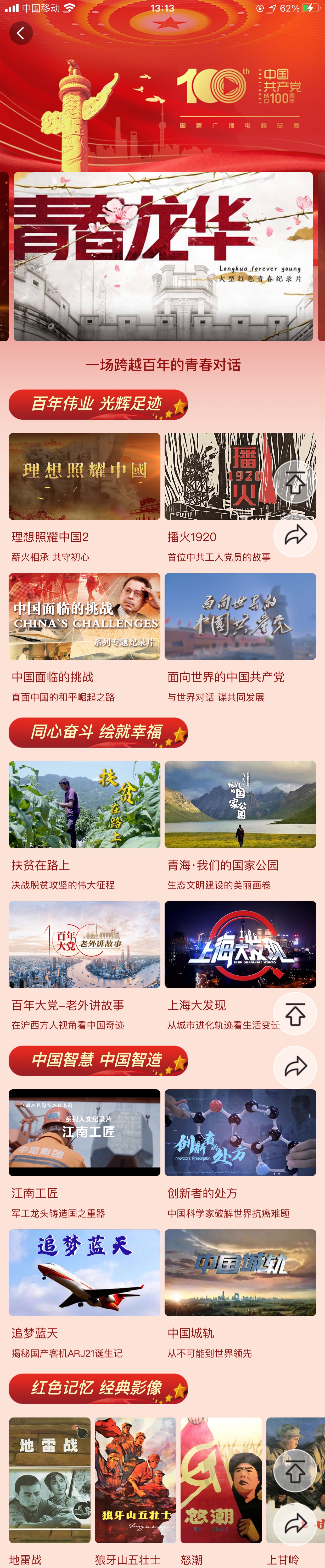 建党百年专区集中展播专题片、纪录片、影视剧和大型文艺晚会,下设“峥嵘岁月”、“光辉历程”、“发展成就”等栏目,推出《理想照耀中国第二季》、《百年大党—老外讲故事》、《潮涌长三角——长三角三省一市庆祝中国共产党成立100周年特别节目》等,聚焦抗日战争等历史进程中的重大历史事件和历史人物,回顾我党领导全国人民砥砺奋进,披荆斩棘的光辉历程,展现十八大以来党领导人民推进伟大斗争、伟大工程、伟大事业、伟大梦想取得的历史性成就。