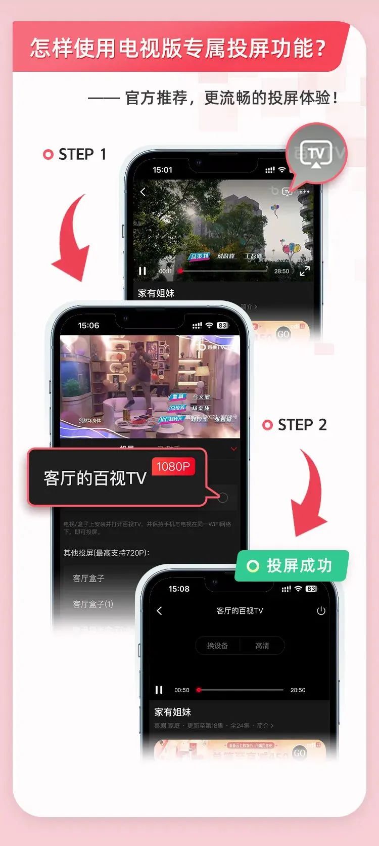 投屏功能迎来了一次技术升级,投屏时,选择百视TV电视版专属投屏,专享1080P以及更高清晰度的投屏特权,此外还可以提高播放稳定性、流畅度,减少卡顿、断流、音画不同步等问题发生。