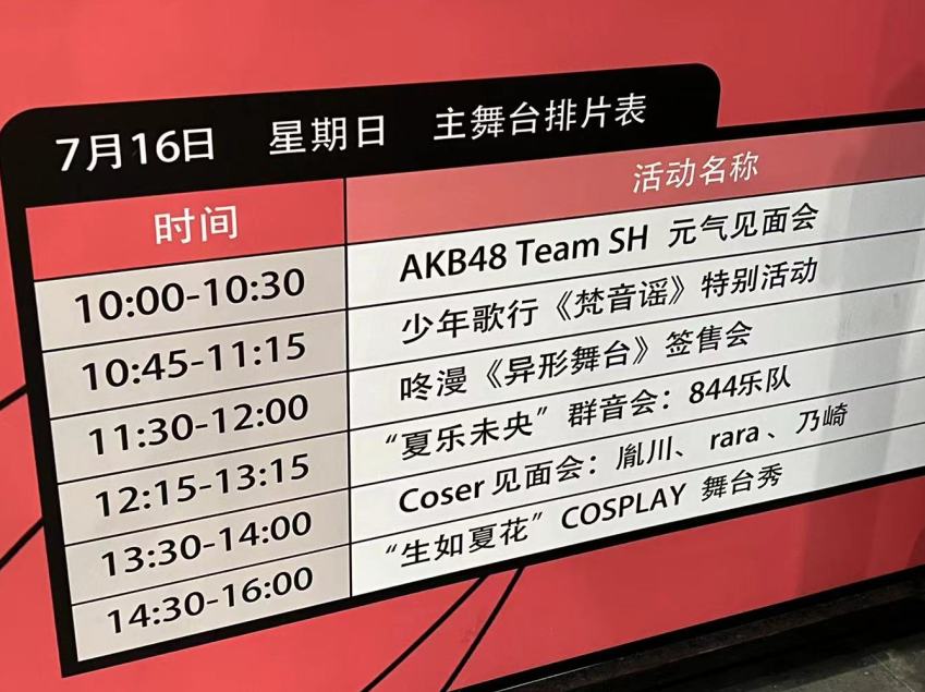 展会现场,各式各样的舞台节目也不容错过。不仅“夏乐未央”群音会和“花YOUNG年华”CCG舞蹈大赛如约而至,今年展会还跨界音乐剧,推出即将在上海第一百货正式首演的音乐剧《少年歌行·梵音谣》特别活动,邀请主演们与大家见面。除了主舞台,现场还设置了官方签售区,AKB48 Team SH等嘉宾纷纷登场,与观众近距离互动。
