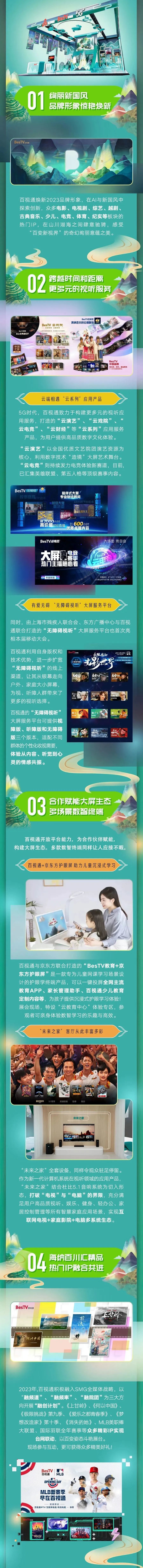算启新程,智享未来。2023年10月11-13日,第11届中国移动全球合作伙伴大会在广州召开,百视通品牌形象焕新亮相,汇聚“云系列”应用产品、“无障碍视听”大屏服务平台、多场景数字终端、热门IP等精彩内容。百视通将与中国移动携手深化融合创新,加速算力网络等新型基础设施建设,推动数字经济和实体经济的深度融合,以数促实,开启数实共生新未来。